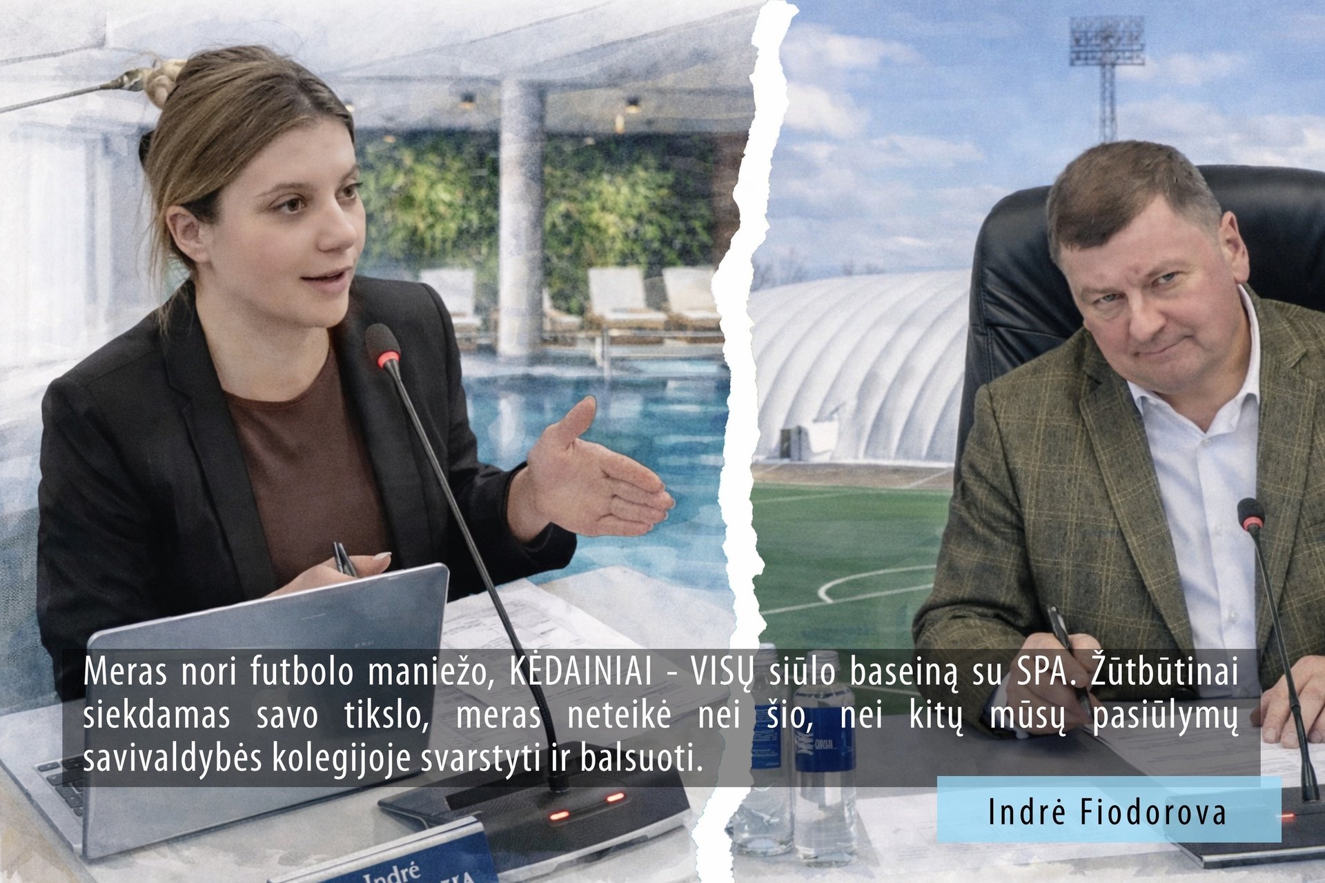 Meras vienas pats nusprendė, kad kėdainiečiams nereikia nei naujo baseino su spa, nei geresnio seniūnijų techninio aprūpinimo, nei didesnių išmokų gimus vaikui. Bandydamas vengti diskusijų dėl savo didelio užsidegimo žūtbūt pastatyti dar vieną dengtą futbolo maniežą, o ne baseiną su spa, visus KĖDAINIAI - VISŲ pasiūlymus bandė atmesti net nepateikęs savivaldybės kolegijos nariams balsuoti.